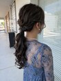 柔らかい質感が魅力のゆるめローポニーアレンジ♪トップとサイドにふんわりボリュームを出して、華やかさをプラスしています。毛先はしっかり巻いて動きを出し、後ろ姿も可愛く◎結婚式やお呼ばれなど、フォーマルシーンにもぴったりな上品スタイルです。