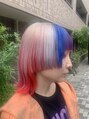 ベースはレッド、ポイントにホワイト、ブルー、パープルとオリジナル配色で仕上げました!前、左右、後ろでカラースタイルが違って見えて楽しいです!派手髪好きにオススメです!