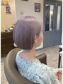 ブリーチベースにラベンダーピンクをしっかり効かせたワンカラー。ツヤ感と透明感を両立させ、首元が綺麗に見えるコンパクトボブとの相性も抜群。色落ちもホワイト系に抜けて長く楽しめます。