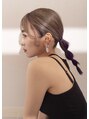 全体をブリーチします。根本はミルクティーシルバーに、毛先は塩基性カラーのパープルで、個性を主張。アレンジで、ゴムを細かく留めてタマネギアレンジ。