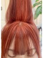 全体を1ブリーチします。分け目から両サイド1cm(計2cm)をオレンジ、全体はピンクブラウンの同系色でまとめると、少しだけ遊びのあるアンブレラカラーの完成です。カットはセミロングの外ハネスタイルです。