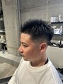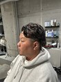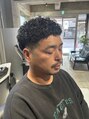 サイドとバックはナチュラルなフェードで引き締めつつ、トップは毛流れを活かしたニュアンスカール仕上げ。軽く流れるようなセンターパートで大人の余裕を感じさせるスタイルです。オンでは清潔感、オフではリラックス感を演出できる万能デザイン。
