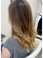 バレイヤージュのスタイルです。バレイヤージュの部分は、15トーンのミルクベージュ。毛先7cmは、ブリーチぬきっぱなしで遊びのあるスタイル。カットはより立体感を出す為にレイヤーを多くいれています。