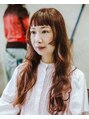 オン眉+姫カットがポイントのロングヘア。色味はオレンジ系のカラーでツヤツヤに!