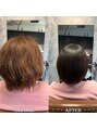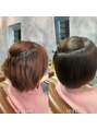 アイロンしてもキレイにならない。まとめられないと、どうしようもない。美髪矯正で癖と質感の改善、美髪カラーでお色味の改善、キレイにまとまるボブにカット。乾かしただけの仕上がりです。まっすぐになりすぎたり硬くなったりしません。