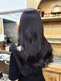 暗髪☆シルバー×ブルーブラック●つやが出るように暗めのカラーに。髪質改善トリートメントでつやつやに!カッはサラサラな髪質をいかして、まとまるように。毛先はコテ巻きです。