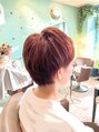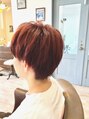 サイドの毛を刈り上げ、全体的に短く動きのあるマッシュショート。顔型と頭の形が面長なので、マッシュ特有の丸みを崩さないように計算しながらカットしています。