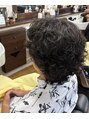 ほどよい髪の毛の長さに縦巻きにロッドを巻いてパーマをあてます。