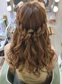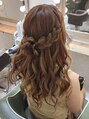 耳出さない編み込みのハーフアップ。抱き合わせの部分にシンプルなお団子、下の巻は緩めのミックス巻き。