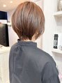 襟足スッキリタイトなふんわり丸みショート。耳かけしてスッキリ。夏ショートおすすめです。大人気なヘアスタイルです!!アイロンやコテ仕上げで簡単にスタイリングできます。ナチュラルブラウンカラーでツヤツヤ、柔らかく見えます。