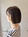 ストレートな質感のタッセルボブです。襟足はギリギリ短くしてすっきりと。顔まわりも耳にかけた際にもみあげの毛をワンカールで巻いて出せるようにカット。カラーは8~9トーンの赤みを抑えて柔らかく見えるオリーブベージュです。