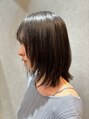 ストレートな質感のタッセルボブです。襟足はギリギリ短くしてすっきりと。顔まわりも耳にかけた際にもみあげの毛をワンカールで巻いて出せるようにカット。カラーは8~9トーンの赤みを抑えて柔らかく見えるオリーブベージュです。