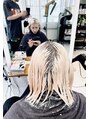 写真を右へスワイプした2枚目がビフォー、3枚目がブリーチ中の写真です。シャドールーツという技術を使って、ハイライトとは一味異なる新しいグラデーションカラーの塗り方です。