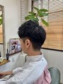 サイドと襟足は刈り上げて耳にかからない長さで被せたツーブロックスタイル!クセを活かして毛流れを☆