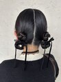 ピタッと感がオシャレな、タイトツインシニヨンヘア。リボンとパールで甘さも♪