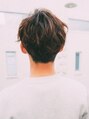 サイドはツーブロックに。襟足はナチュラルにつながる長さでスッキリと。バングは長めでサイドはスッキリ!ブロックにはカラーを入れず、他はブラウンにハイライトでトップは明るめに、全体にメリハリのあるスタイルです。