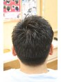サイドとバックは少し厚みを持たせた刈り上げで、トップは立ち上がるくらいに短くカットして根元付近から梳いて軽さを出した王道のベリーショートです。