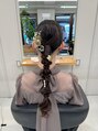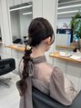 表面はタイト気味にして艶をだし、下目のポニーテールに毛先はふわふわしすぎない編み下ろしにしました。