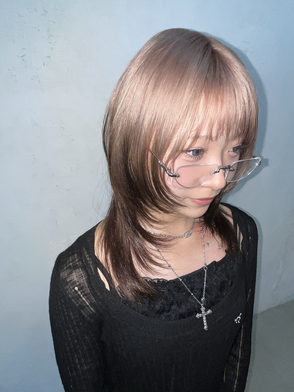 耳横にぽこっとボリュームがきて首元で自然にくびれるウルフヘアデザインカラーとの相性も良くうち巻きワンカールにするだけでおしゃれ上級者に!