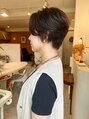 襟足スッキリ目のショートスタイルです。前髪は長めに流れるような動きをつけて後ろをしっかりタイトにすることでメリハリのあるヘアスタイルにしています。