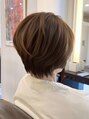 毛先を軽く外ハネさせた切りっぱなしボブで、抜け感とこなれ感を演出。ツヤ感ブラウンで上品さをプラスし、シンプルなのにおしゃれ見えする大人スタイル。[福岡/天神駅/白髪ぼかしハイライト/ショートカット/ショートボブ/髪質改善/白髪染め]