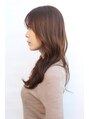 レイヤーをいれ、アイロンで動きをつけたスタイルです。巻きやすいように毛先は厚めにブラントでカットしている点が特徴です。前髪は薄めにカットして柔らかさを出しています。カラーは赤みをなるべく消せるグレージュ系をチョイス