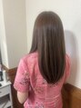 元のオレンジ味が強いカラーを打ち消す為にブルーを補色としたアッシュ系のオーガニックカラーを使って透明感たっぷりの色にしました。元々のお肌の綺麗さに相乗効果が出ました。超音波トリートメントでツヤ感もアップ。