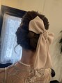 ヘアアクセサリーに合わせて髪でもリボンテールを作り、上品で可愛らしい印象に。顔まわりは柔らかく下ろして抜け感をプラス。特別な日をより素敵に彩る華やかアレンジです。