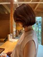 柔らかいピンクブラウンで、自然光に溶け込むような艶とあたたかみを。軽く外にハネたボブに、動きをつけてナチュラルな抜け感をプラス。季節の変わり目に似合う、軽やかなブラウンボブ。