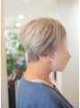 白髪染めを卒業してグレーヘアが素敵なお客様です。今回は伸ばしていた髪をスッキリショートヘアにしました。前髪を短くして、両サイドの長さを変えたアシンメトリーにカットをして、ちょっとだけ個性的に仕上げました。