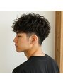 前下がり気味のツーブロックにツイストスパイラルをかけたモードショート。毛流れを立体的に見せ、無造作な動きでストリート感を演出したスタイル。