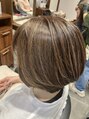 前下がりのグラデーションボブ。全体を明るめのグレイカラーで染めて筋感が分かるハイライトを入れました。