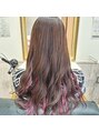 インナーにブリーチ後、塩基性カラーのピンクとホワイトをミックスしてオンカラー。表面はナチュラルなツヤブラウン。顔周りは個性をプラスしてナチュラルな姫カットに。