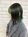 インナーカラーの幅を広めに作る切りっぱなしボブ緑と黒の比率を9:1にしたデザインカラーにしています。前髪にもしっかりと色の出るスタイルでおすすめです。