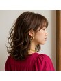 華やかな大きめカールのデジタルパーマ。 艶とボリュームを兼ね備え、ゴールドアクセが映えるエレガントスタイル。