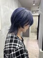 ウルフスタイルにカットし、全体はブリーチ。ラベンダーベースの色味に青の色味を少し混ぜました。