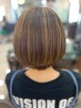 細かめのハイライトを表面に入れることで、丸みのあるボブに立体感と軽さをプラス。柔らかなベージュが上品さと血色感を与え、大人可愛く仕上がります。 [用賀/髪質改善/オージュア/ハイライト/縮毛矯正/白髪ぼかし/リタッチ/白髪染め/メンズ/]