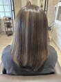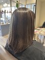 肩より少し下のミディアムヘアシルエットは後ろがやや重めで毛先に軽くレイヤーを入れることでパツッとしすぎず、動きをつけやすいヘアスタイルです。派手になりすぎないよう、ハイライトを入れてベースの色となじみやすいように仕上げました。