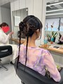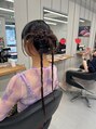 ベースは二つ結びで毛先をお団子にしたり、ハネさせたり、三つ編みやツイストなとmixしてアレンジしました。崩れにくいヘアスタイルです。