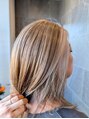 元々1度前頭ブリーチしているお客さまで顔周りはフェイスフレーミングをやっていてブリーチの回数も2度やっていて今回は根本のブリーチをして全体にベージュ系のお色を被せました。またフェイスフレーミングのところも明るいベージュでお色を出しました。