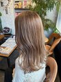 明るめベースはそのままにオリーブベージュ系のカラーに。32mmコテで外ハネに巻いてオイル仕上げでしっとりと。バングは長めに顔まわりはレイヤーをいれて動きを出してます。