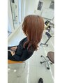 柔らかく動きの出るレイヤースタイル。赤みのあるブラウンカラーでツヤ感を出しつつ、毛先に軽くカールを入れてナチュラルな仕上がりに。顔まわりのレイヤーで小顔効果も◎