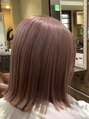 外ハネの切りっぱなしボブにピンクベージュのカラーで柔らかい印象に