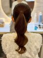 柔らかなカールで、上品な印象のポニーテール。シンプルながらも女性らしさを引き立てる人気スタイルです。結婚式やお食事会など、きちんと感を出したい日におすすめです。