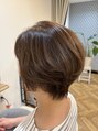 襟足はギリギリめに切り、トップにボリュームが出るようにレイヤーをいれました。色は黄味を消すよう、ラベンダーアッシュとベージュをミックスし柔らかい印象にしました。