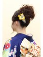 今回のスタイルは、振袖との相性が抜群のふんわりシニヨンアレンジに、華やかな黄色の髪飾りを合わせた王道の成人式ヘアです。後頭部にボリュームを持たせた上品なまとめ髪は、横顔・後ろ姿ともに美しく、写真にも綺麗に残せる人気デザイン