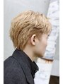 ブロンドのメンズショート。横後ろは刈り上げないギリギリのスッキリ目前髪は眉毛ラインスパイキーショートなどの伸ばしかけスタイルにもオススメです。