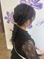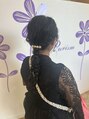 ゆるく崩した編み込みをローポニーでまとめ、パールアクセをポイントにした上品なヘアアレンジ。後れ毛をほどよく残すことで、抜け感のある柔らかい印象に仕上げています。