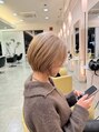 ハイトーンでベージュを重ねることで柔らかさと上品さを表現しています!そこにショートボブであまり切り込みすぎないスタイルで襟足はしっかり首に張り付かせることで首元が綺麗に見えるようにカットしました!ハイトーンとショートも相性がいいです!