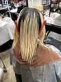 青のシャドールーツカラー。全体的にブリーチ履歴のある髪で、今後ブリーチをやめていく方向だったので、根本が伸びてきても気にならないように根本の方は暗いカラー剤で影を足して、ブリーチ部分には色を入れて陰影のあるスタイルに。